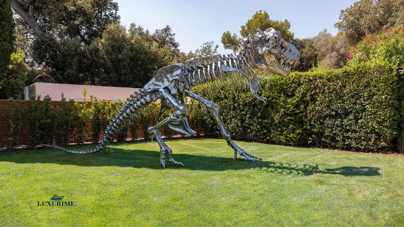 Step into a world of understated opulence, where art, nature, and history intertwine. The villa’s interiors exude elegance with wooden floors, neutral beige tones, and accents of white and grey marble. Unique sculptures by artist Gregory Bonnard—including a life-size tyrannosaurus and a pterodactyl perched among the trees—alongside vibrant modern artworks, create an enchanting ambiance.