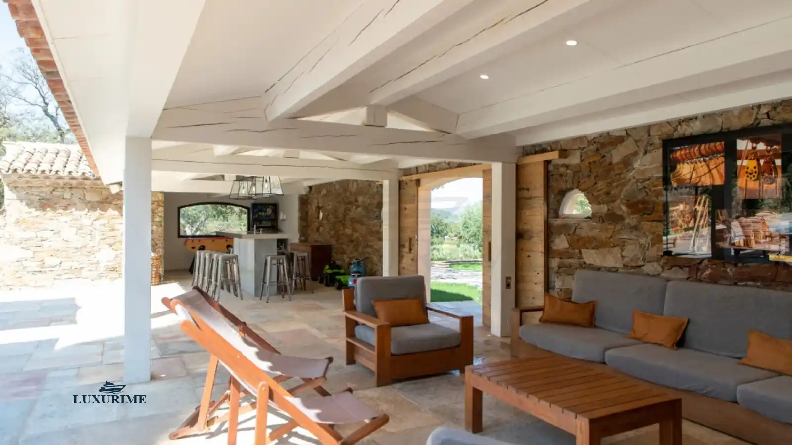 The heated swimming pool, set opposite the bastide, forms the vibrant social hub of the estate. Here, days are spent lounging under the Riviera sun, enjoying refreshing swims, and sharing gourmet moments at the outdoor high table. Friendly competition awaits at the outdoor table soccer, all while surrounded by the Olympian calm of the natural landscape.