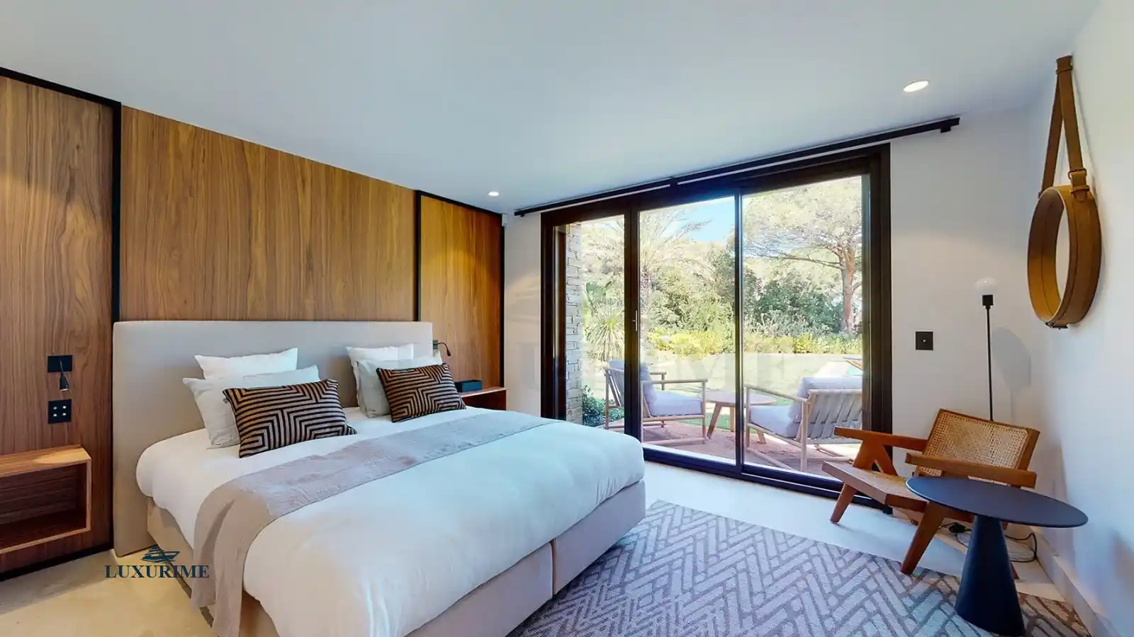 Bathed in natural light, the villa’s refined interiors feature harmonious stone facades, bespoke décor, and expansive living areas. The five en-suite bedrooms—each with a luxurious bathroom (shower or bathtub)—accommodate up to 10 guests in absolute comfort. Some rooms open onto private terraces overlooking the landscaped gardens and heated swimming pool, while others offer direct garden access, ensuring a tranquil retreat for every guest.