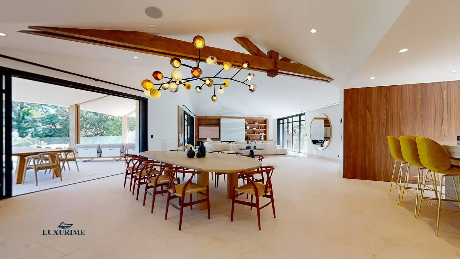 • Gourmet Kitchen & Dining: The state-of-the-art kitchen, seamlessly connected to the dining and living areas, boasts exposed beams and a warm, inviting atmosphere—perfect for shared meals and lively gatherings.