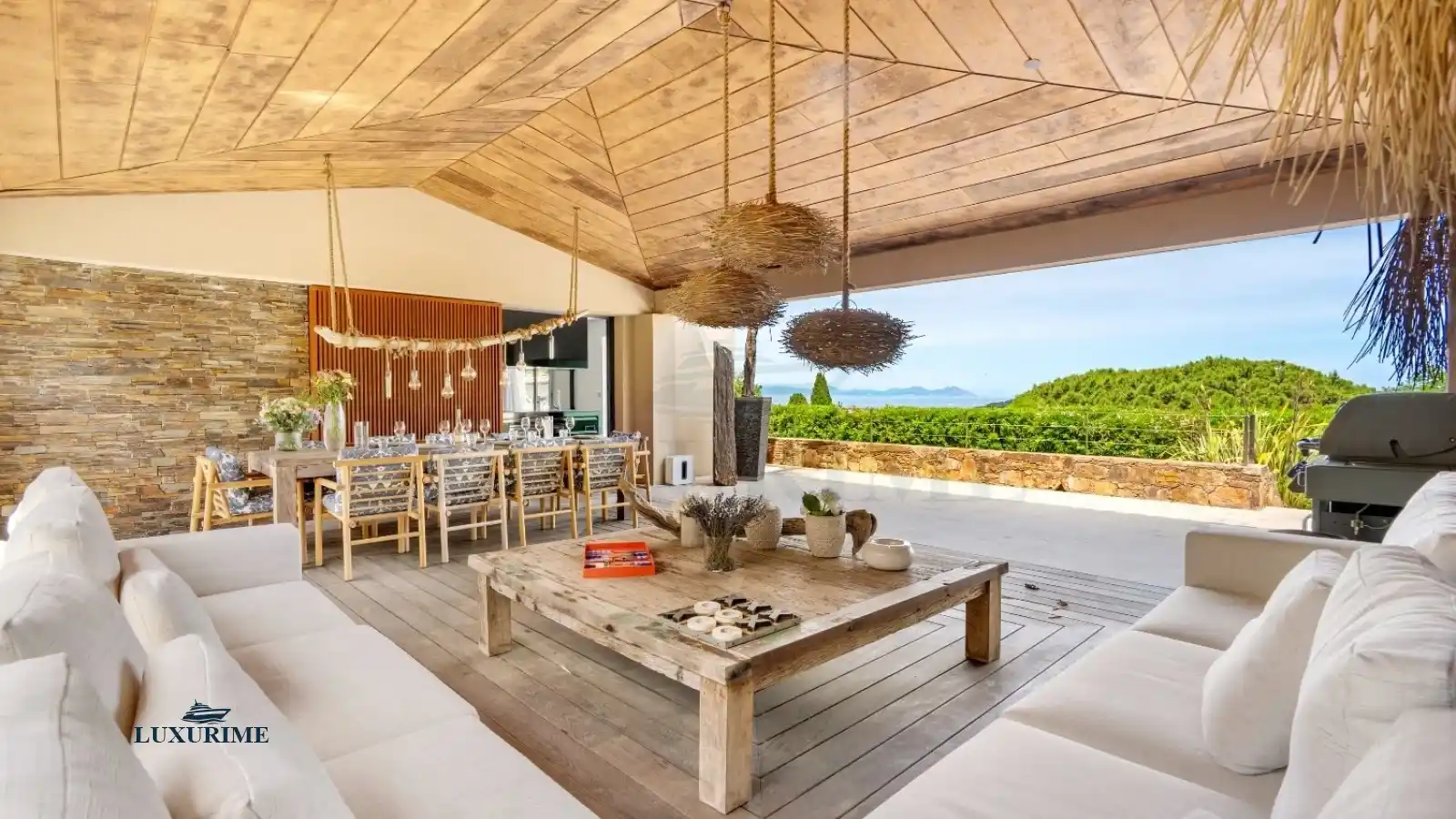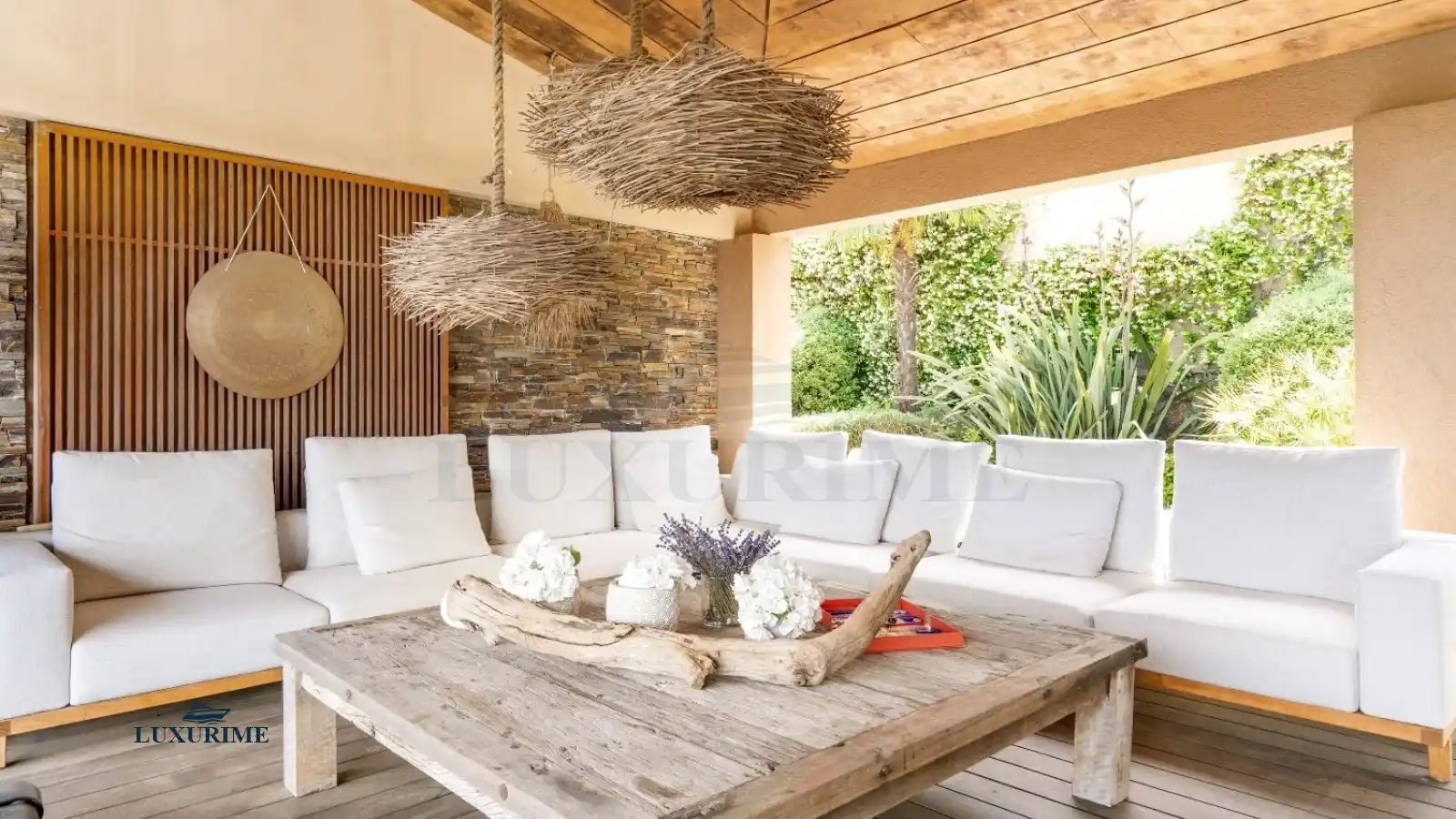 The communal areas, generous and inviting, lend themselves beautifully to lively lunches, leisurely aperitifs, and evenings under the stars. The indoor dining area extends naturally to a vast covered terrace where you can enjoy the Tropezian lifestyle, sheltered from the sun. The garden, a true park adorned with Mediterranean flora, becomes a natural playground for children, a peaceful promenade for elders, and a green haven for all.