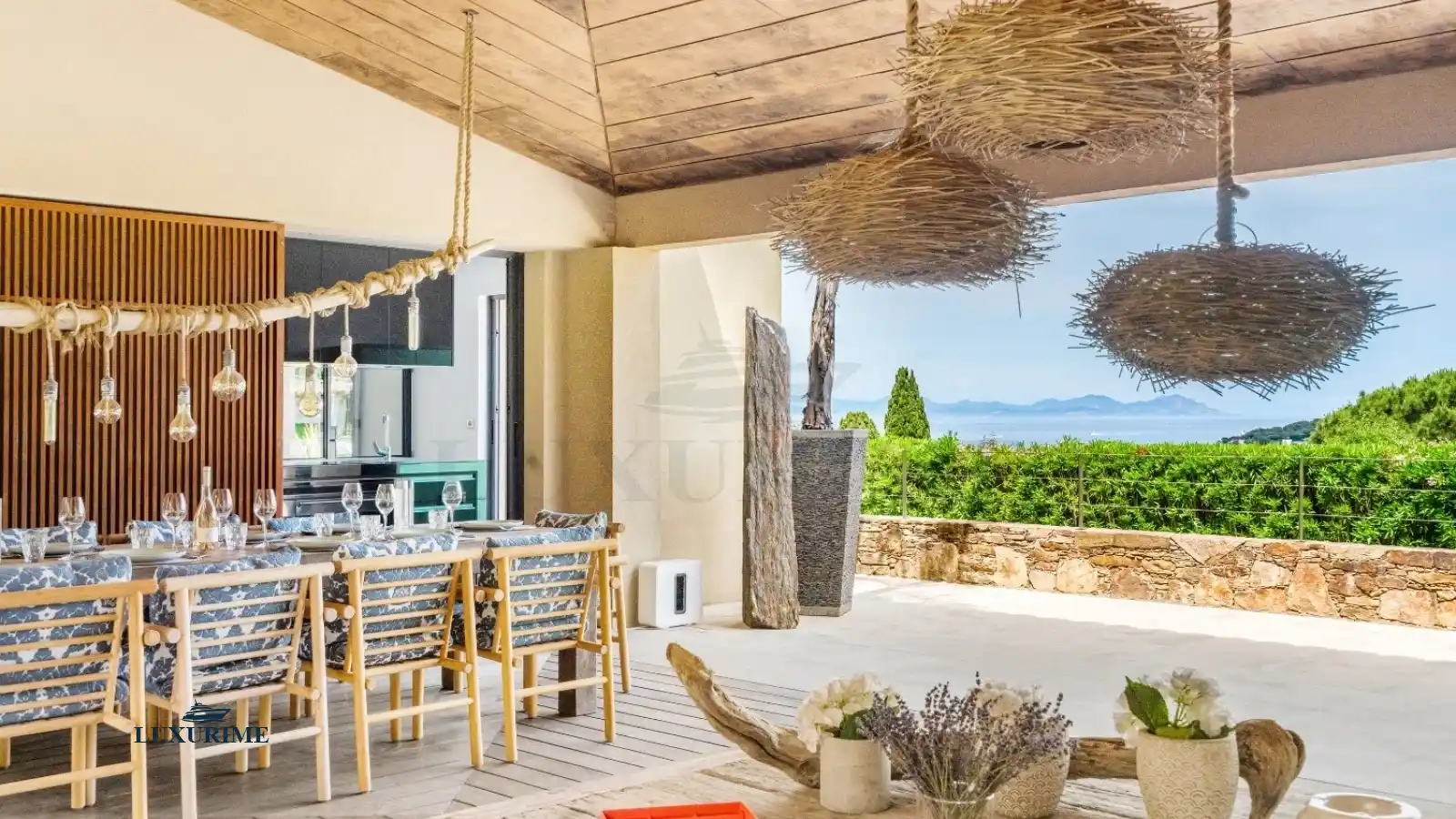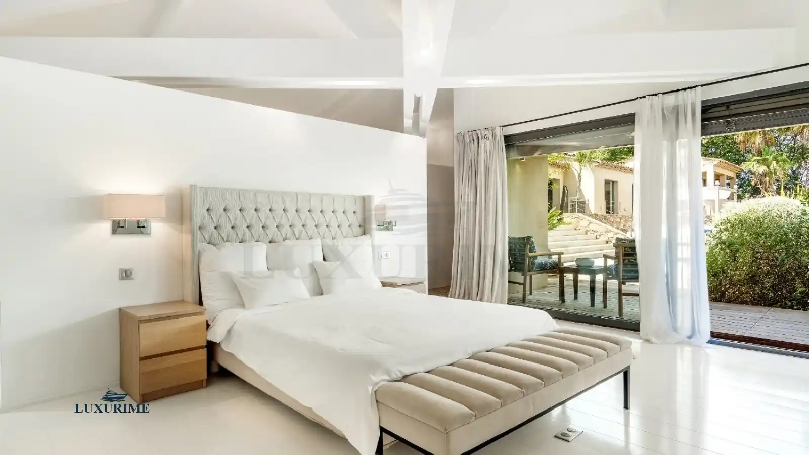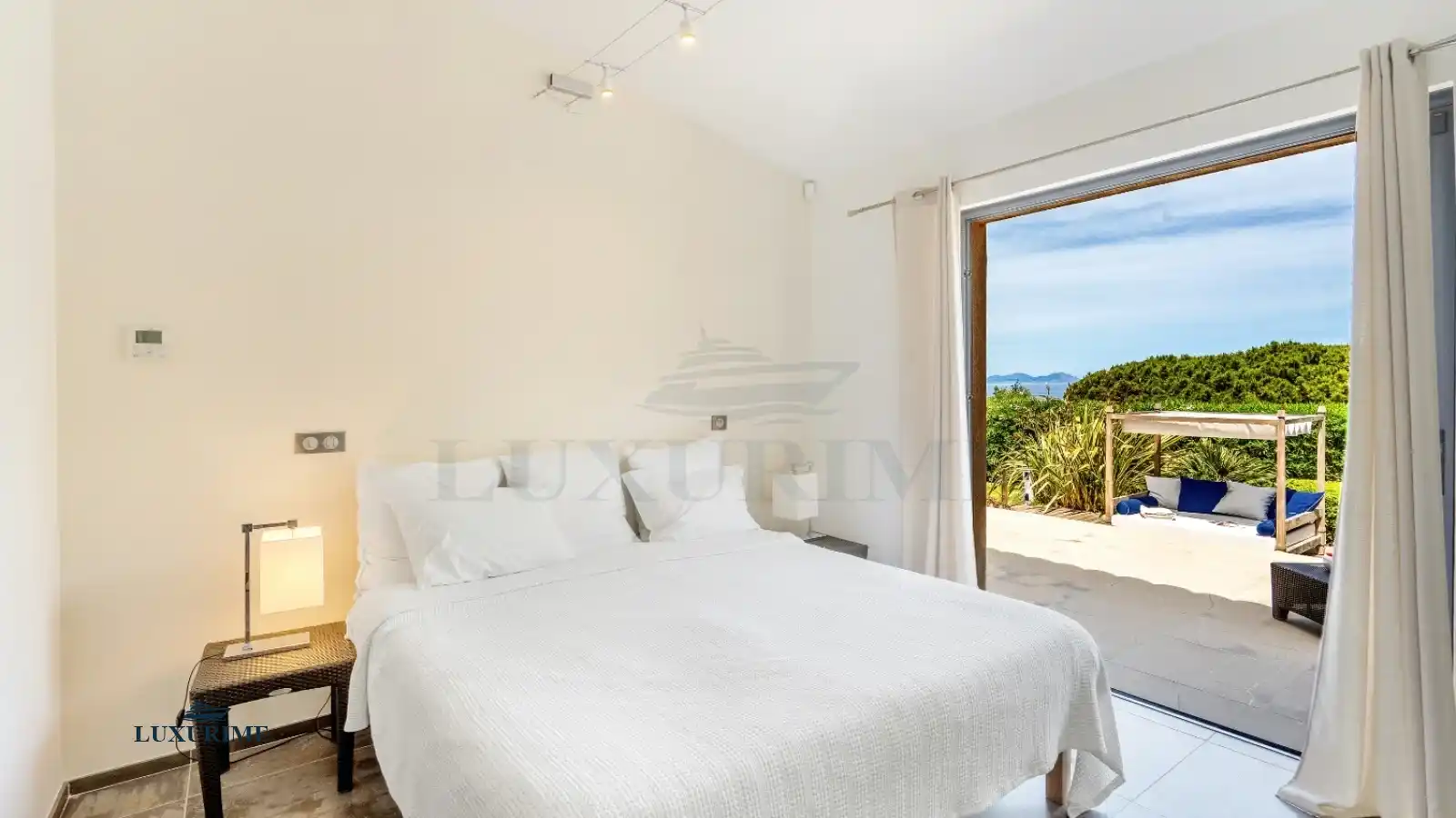 Behind its understated façade, the villa reveals vast, light-filled spaces designed to foster reconnection, sharing, and the simple joy of being together. The main living room, both elegant and welcoming, opens generously onto the outdoors, flowing seamlessly into the landscaped gardens and swimming pool. Here, Mediterranean nature merges with the shimmering sea views to create an atmosphere of absolute serenity.