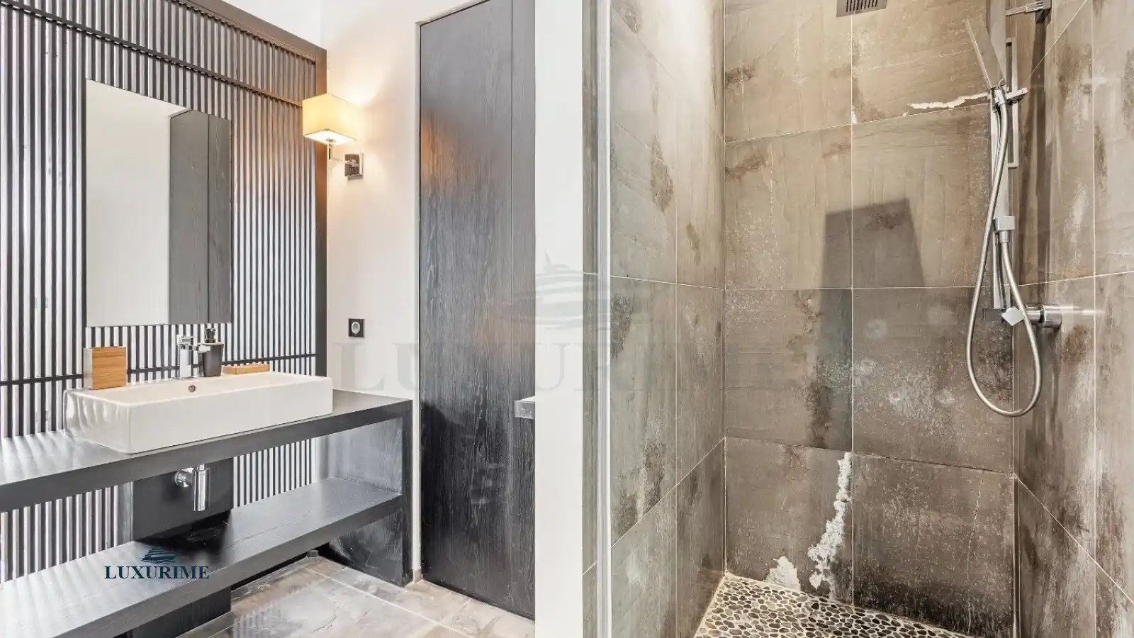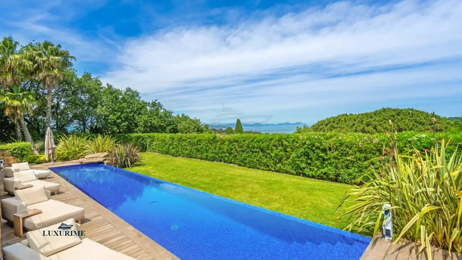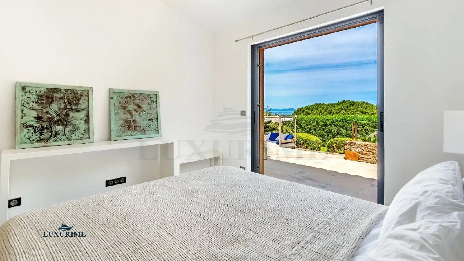 Behind its understated façade, the villa reveals vast, light-filled spaces designed to foster reconnection, sharing, and the simple joy of being together. The main living room, both elegant and welcoming, opens generously onto the outdoors, flowing seamlessly into the landscaped gardens and swimming pool. Here, Mediterranean nature merges with the shimmering sea views to create an atmosphere of absolute serenity.