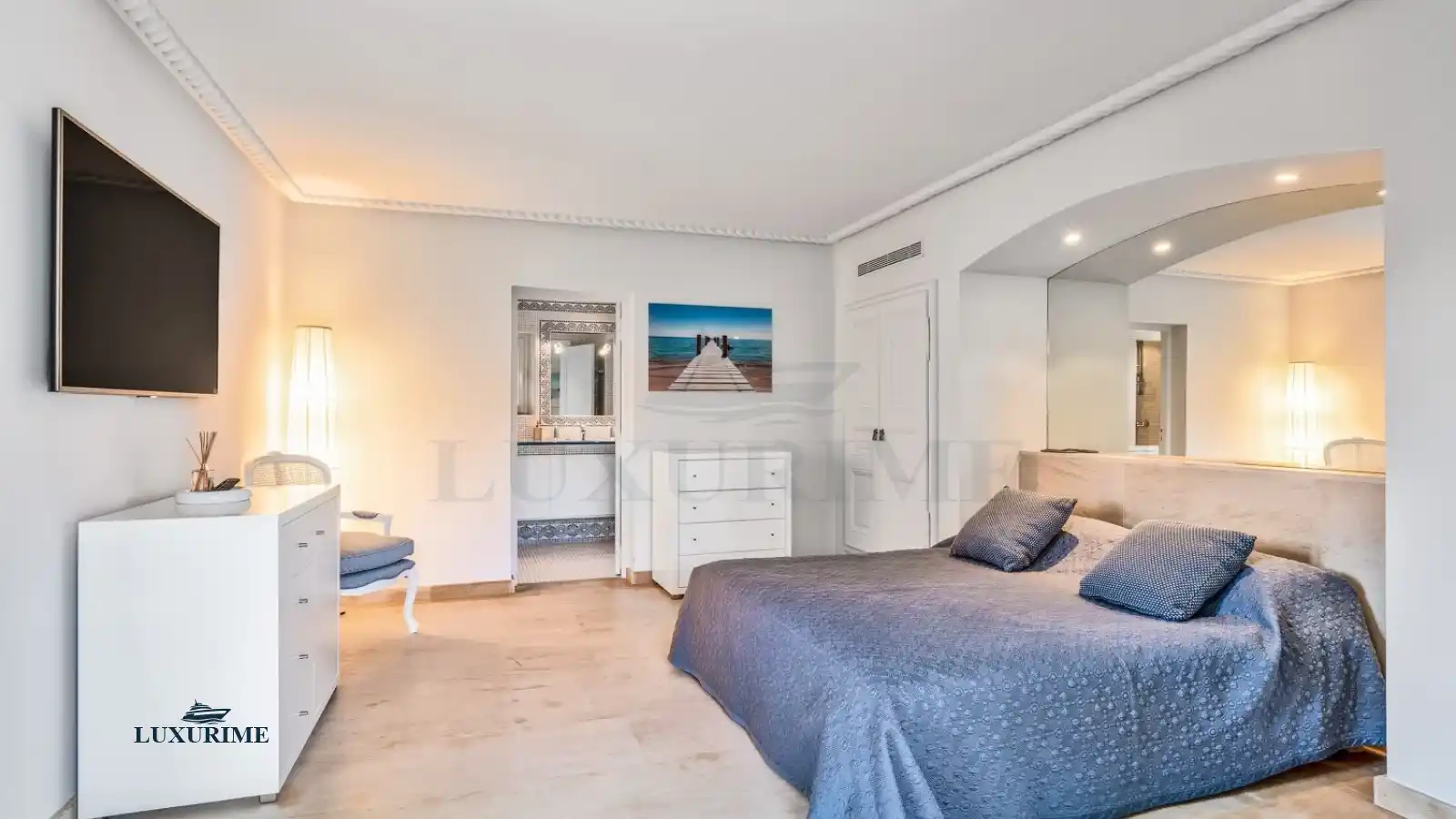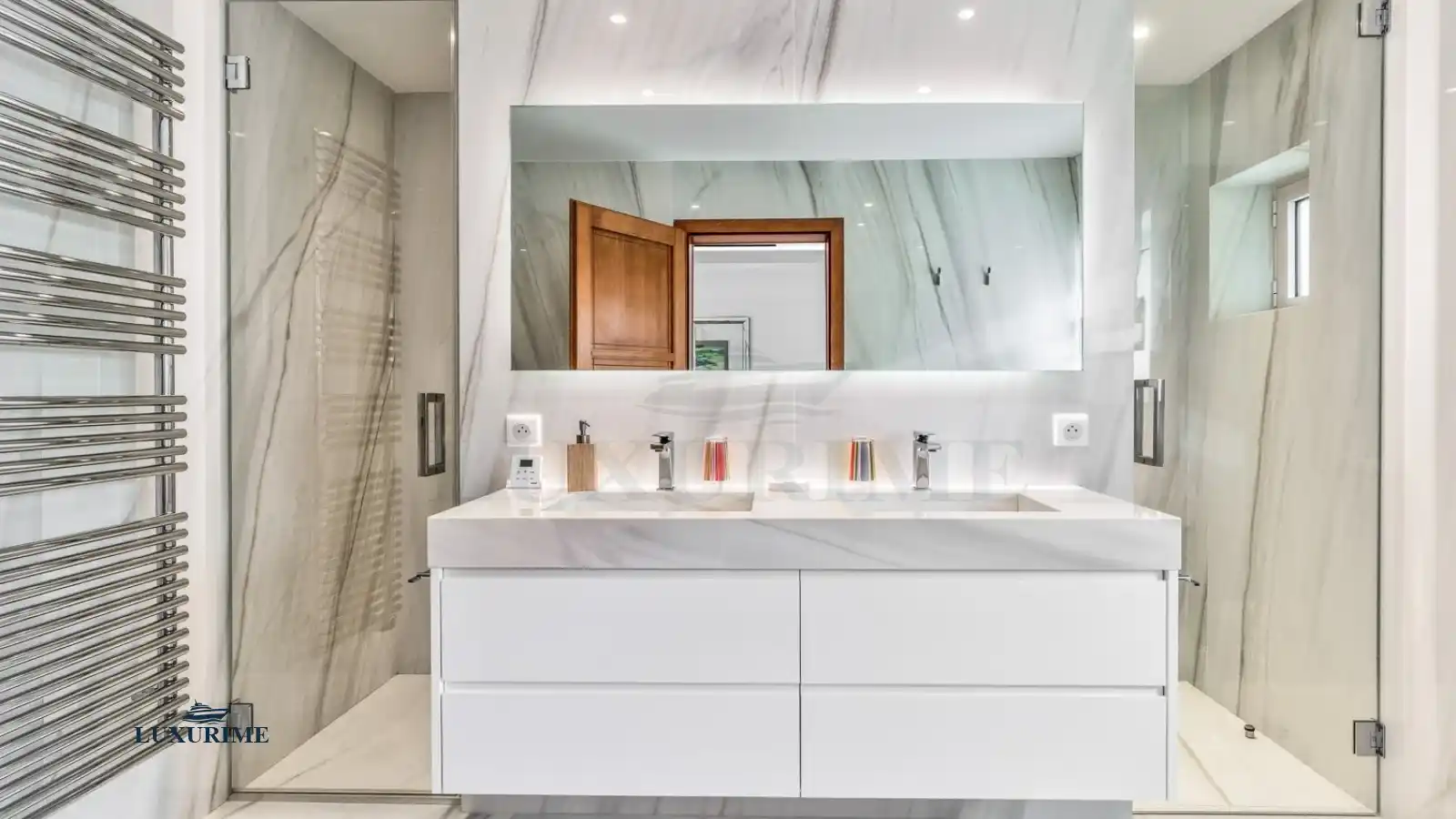 Spanning 700 m² of refined living space, Villa Cascade can host up to 20 guests in supreme comfort. Its 10 double en-suite bedrooms are adorned with contemporary, elegant décor and boast private bathrooms, ensuring complete privacy for every guest. Vast picture windows and sweeping terraces frame mesmerizing sea views, inviting you to immerse yourself in the serene Mediterranean panorama.