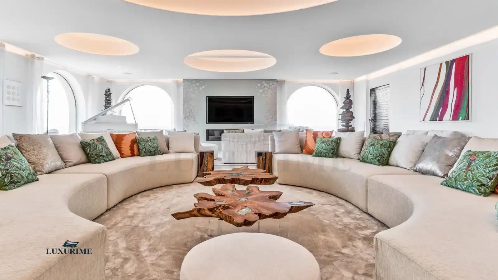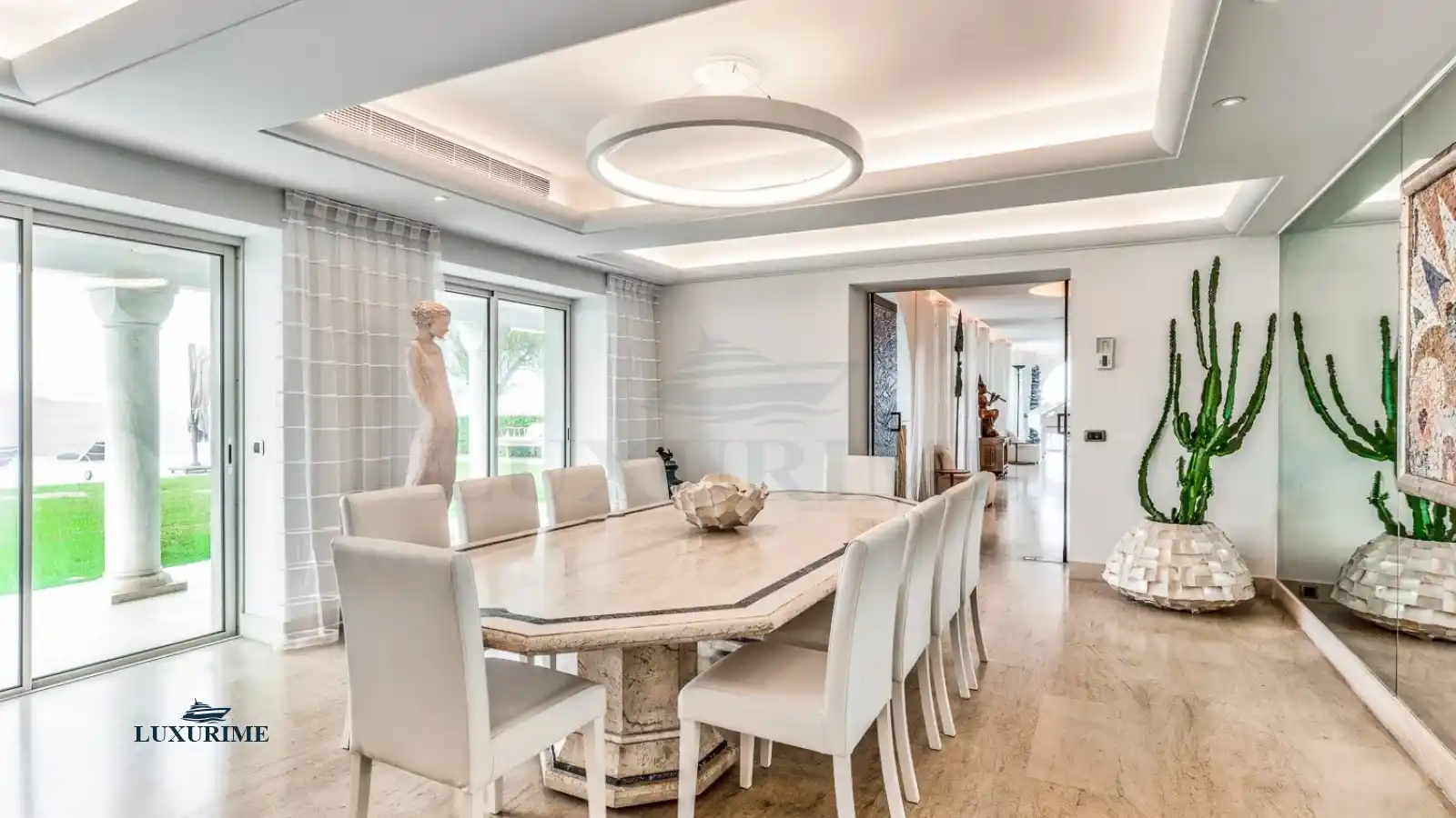 At the heart of Villa Cascade, the expansive living room is the perfect backdrop for memorable gatherings. An elegant bar, a piano for music lovers, and plush circular sofas create an ambiance of sophistication and warmth. Whether sharing an aperitif, enjoying live music, or relaxing with friends, the villa offers an atmosphere of both grandeur and intimacy.