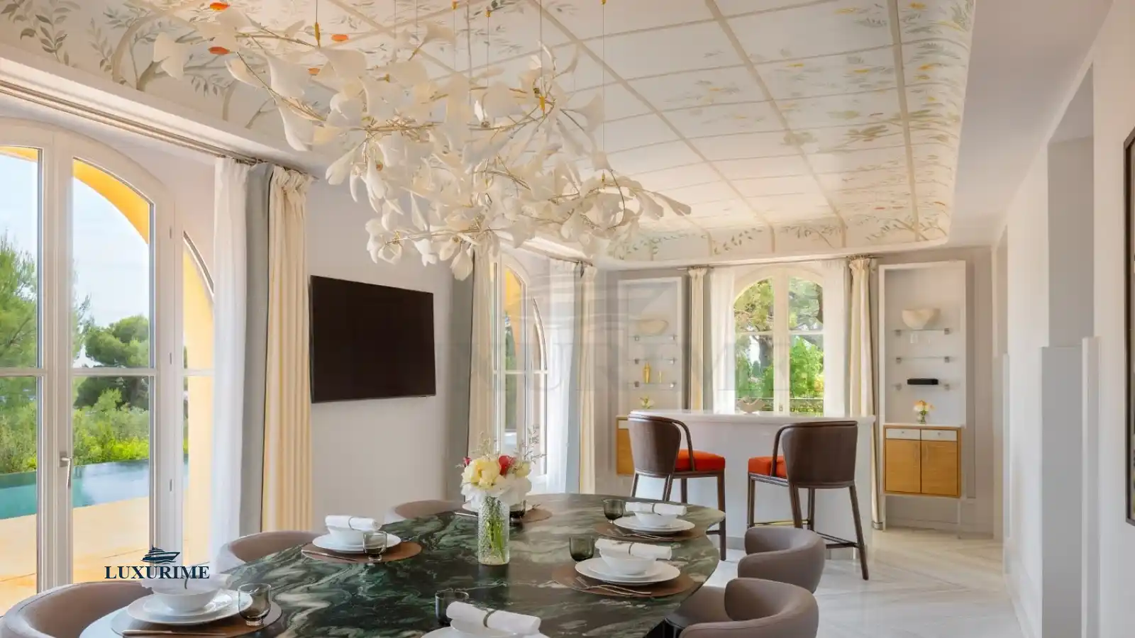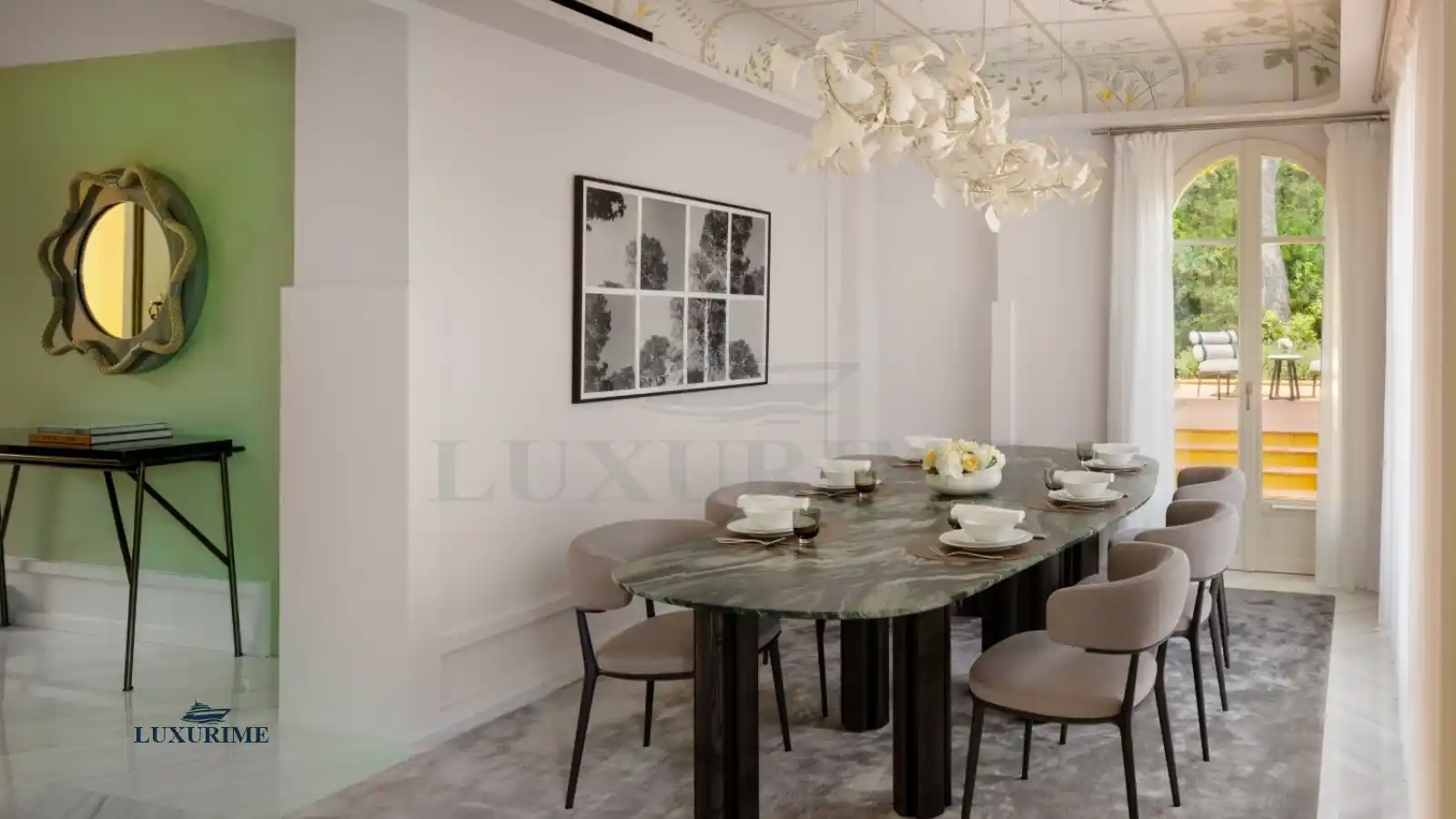 A dining room adorned with a hand-painted ceiling and a stunning marble table, ideal for gourmet dinners
