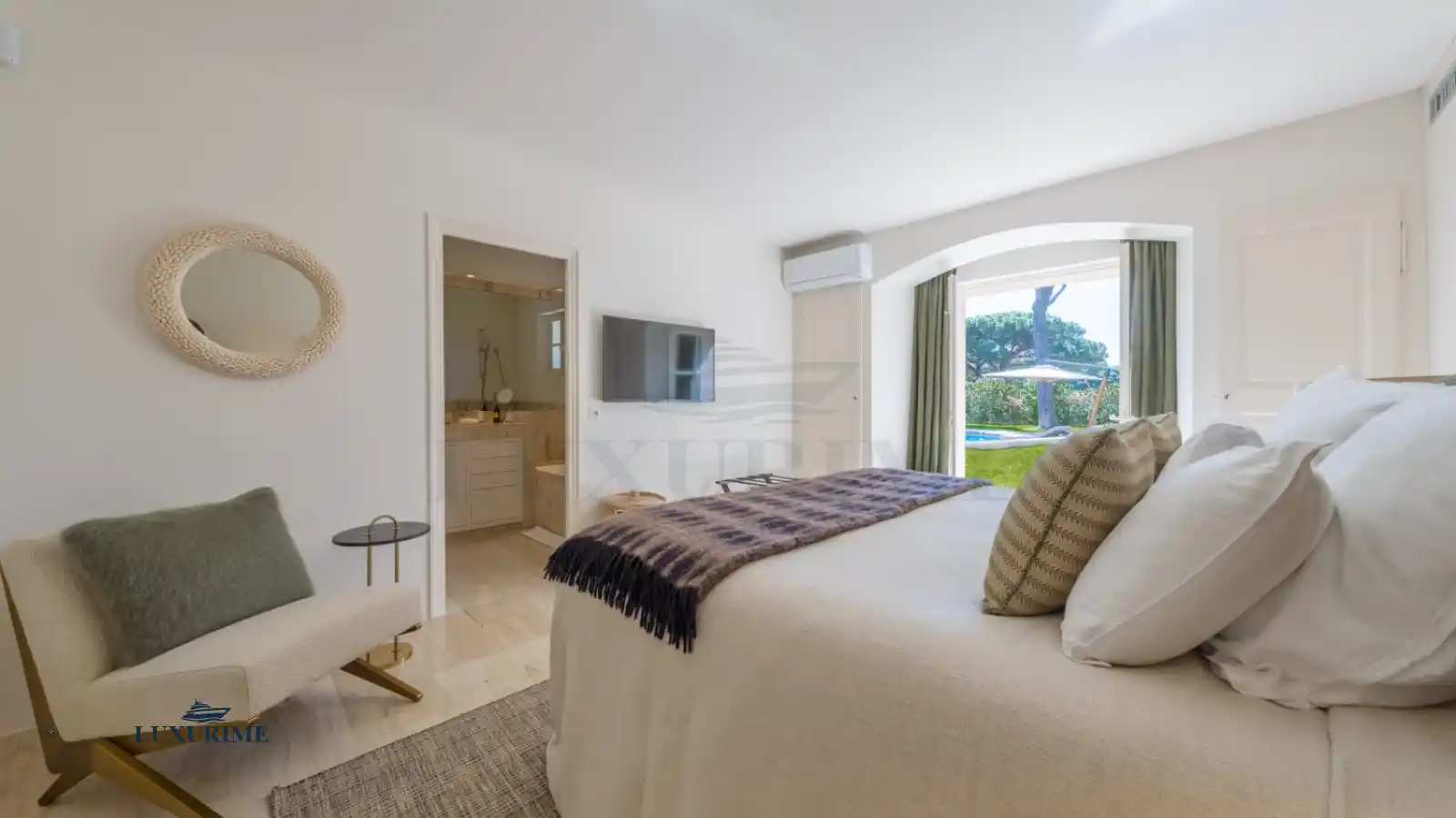 • Master Suite: Features a private, expansive terrace offering stunning views over the villa's lush private park and the sparkling swimming pool.