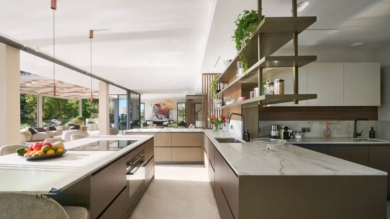 The villa’s sleek layout creates a seamless flow between indoor and outdoor living. Generous open-plan interiors open onto sun-drenched terraces, with elegant lounges and dining areas offering space for entertainment and relaxation. Expansive windows frame breathtaking sea views, flooding the villa with natural light.