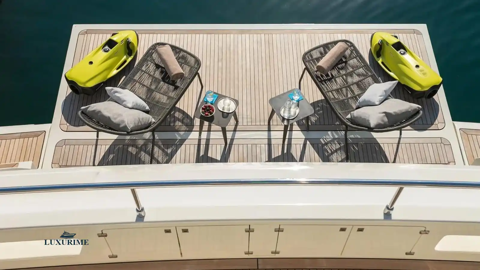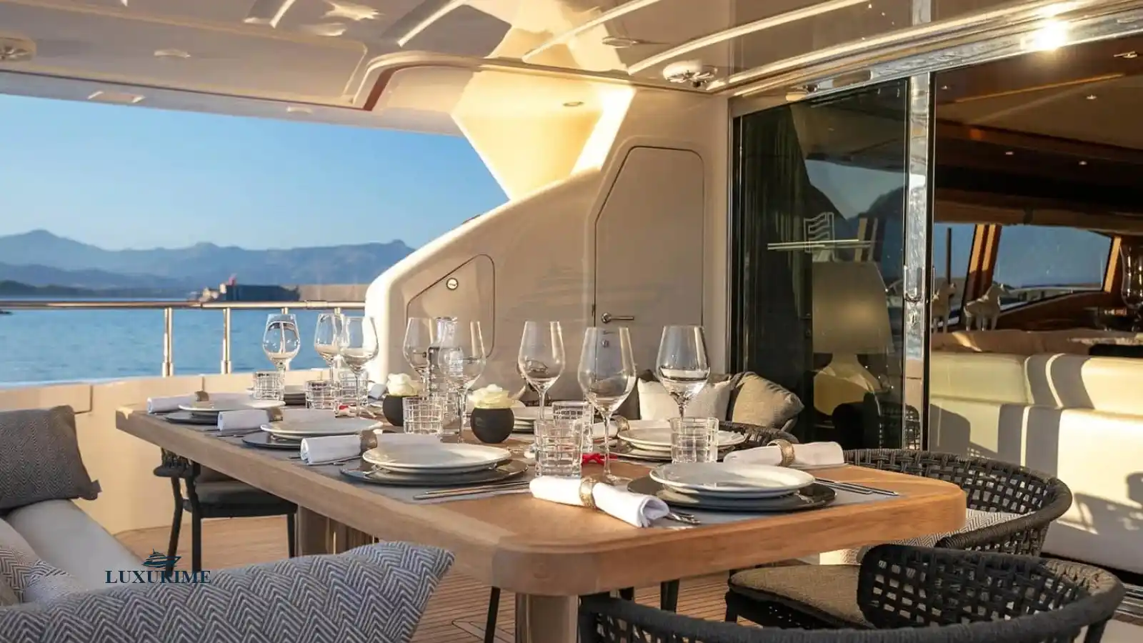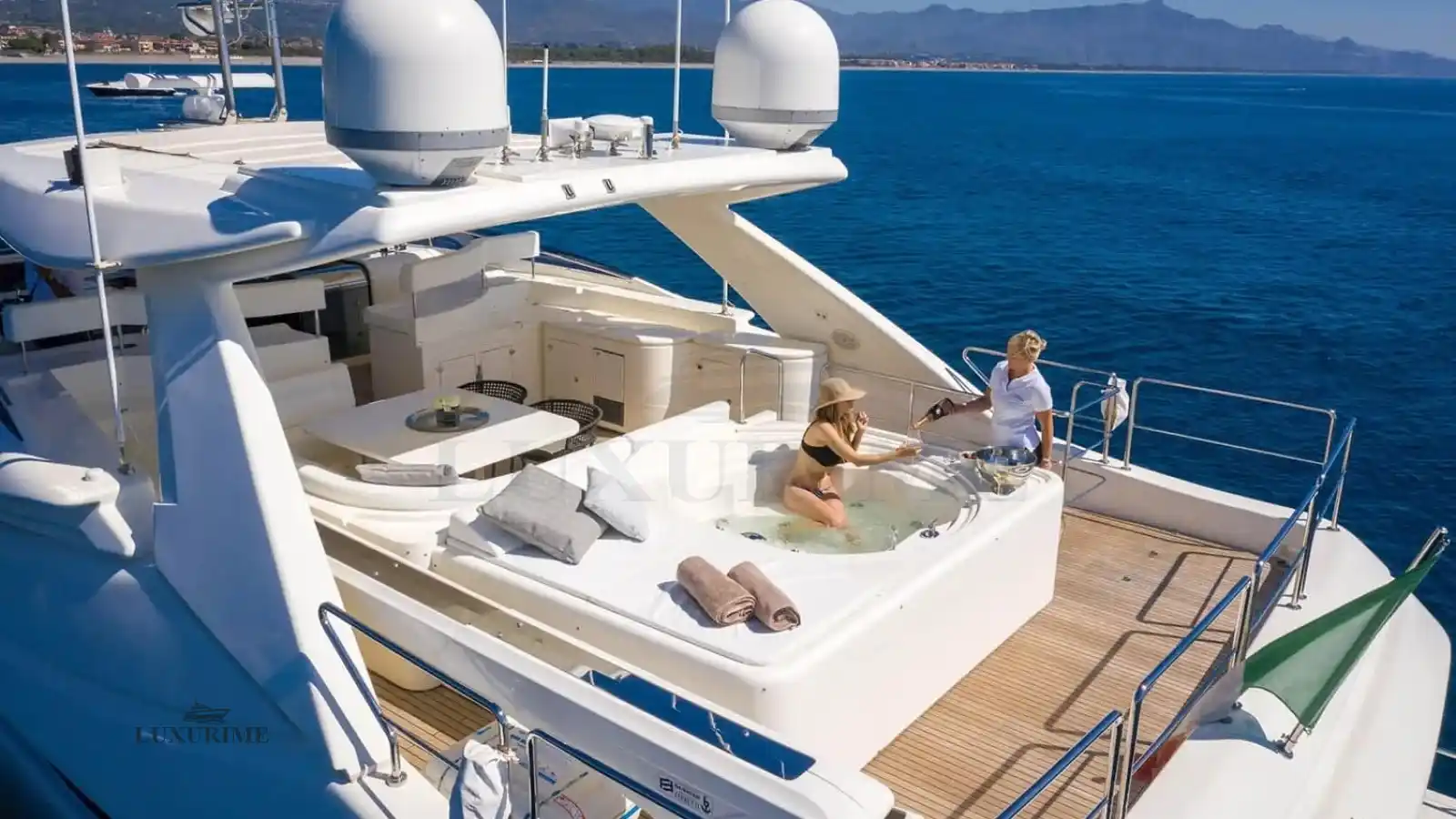 Sun worshippers can unwind on the flybridge sunpads or enjoy alfresco dining on the aft deck, surrounded by the sparkling Mediterranean.