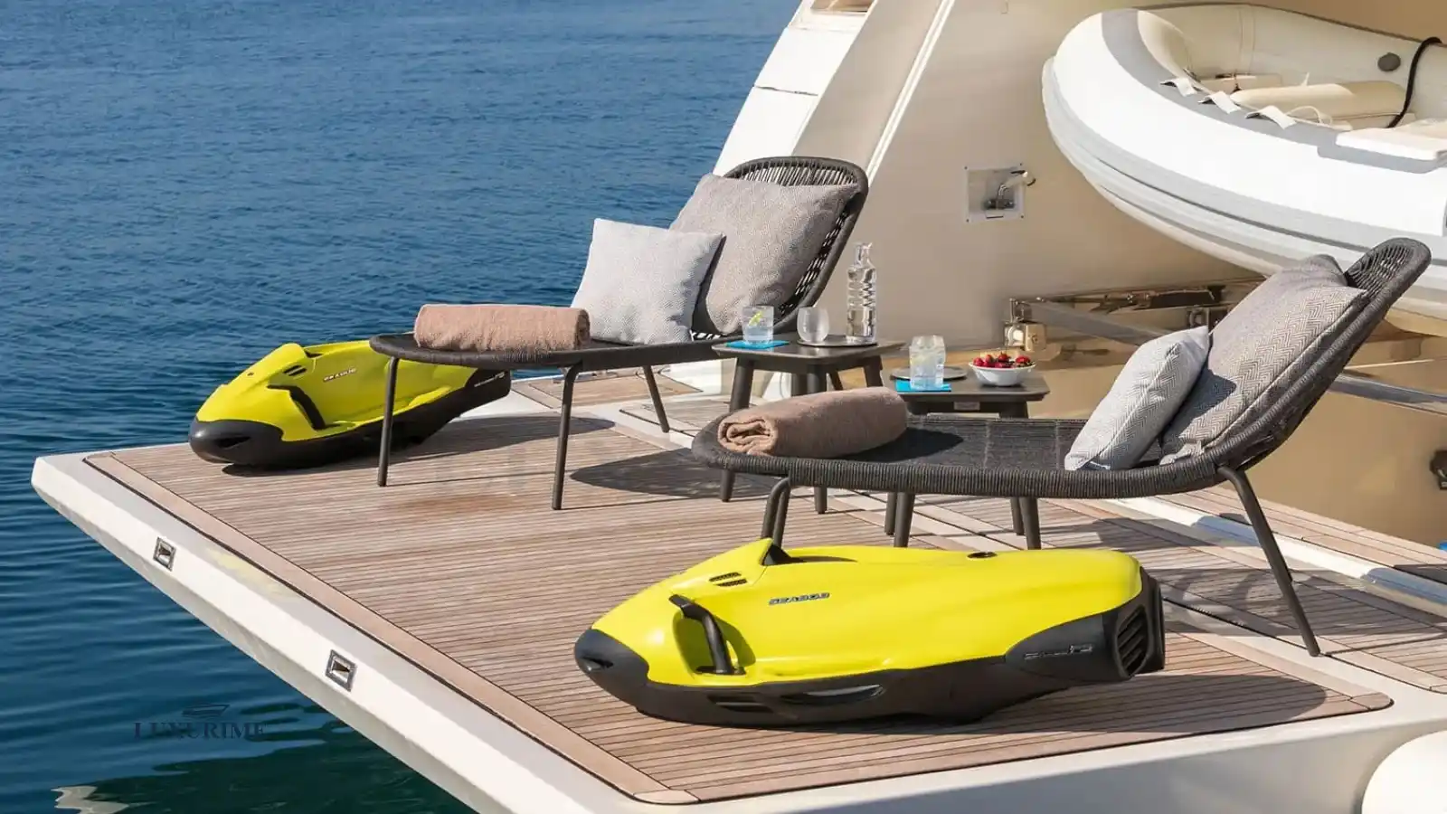 Designed for indulgence, ETHNA’s expansive flybridge is the ideal spot to soak in panoramic views while lounging in the jacuzzi or sipping cocktails crafted by the professional crew of five. The retractable swim platform provides easy access to the water, where an array of toys and equipment await: