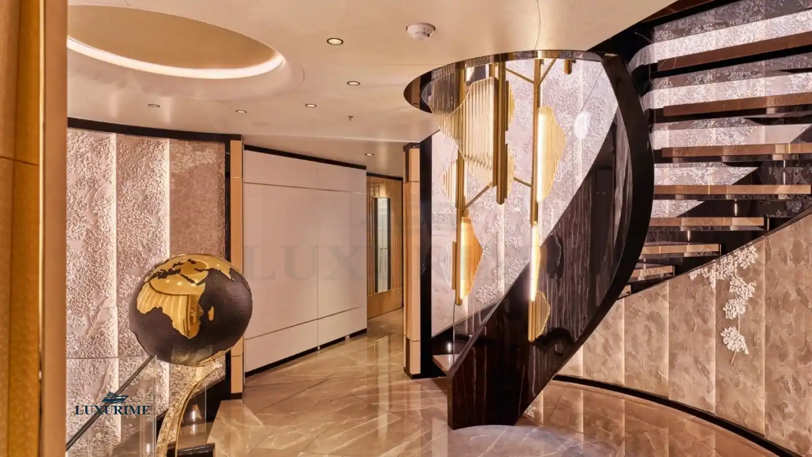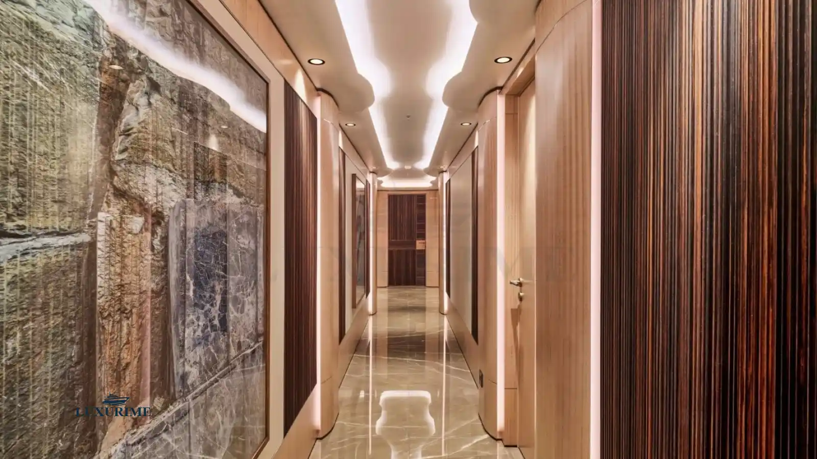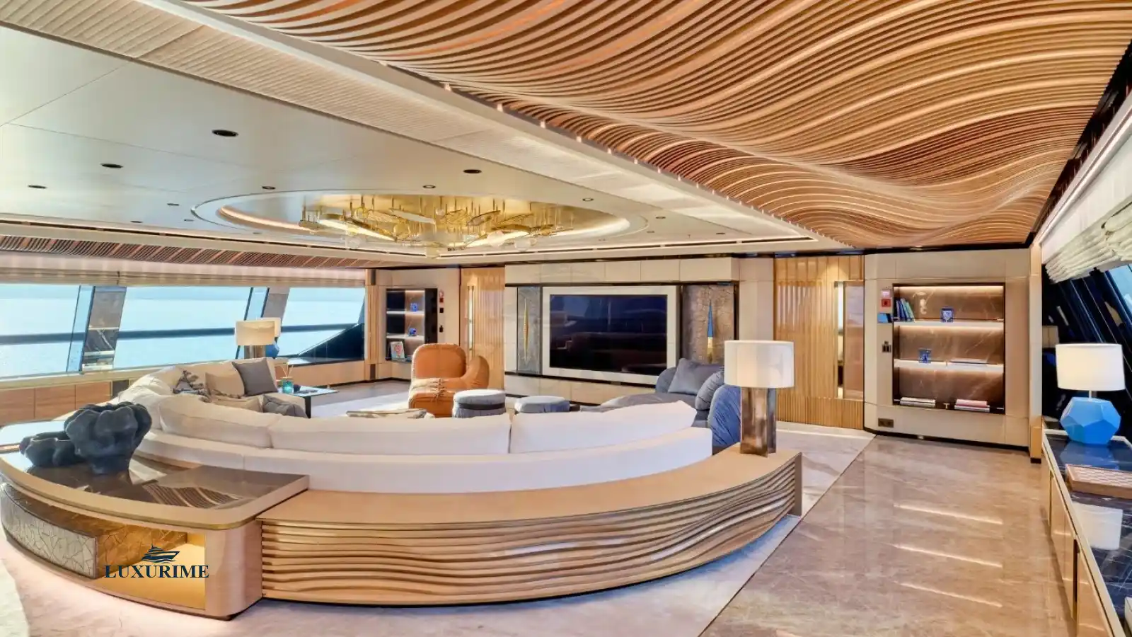 Stunning Design: Sleek exterior lines by Studio Vafiadis and opulent interiors featuring contemporary styling with rich woods, marble accents, and plush furnishings.