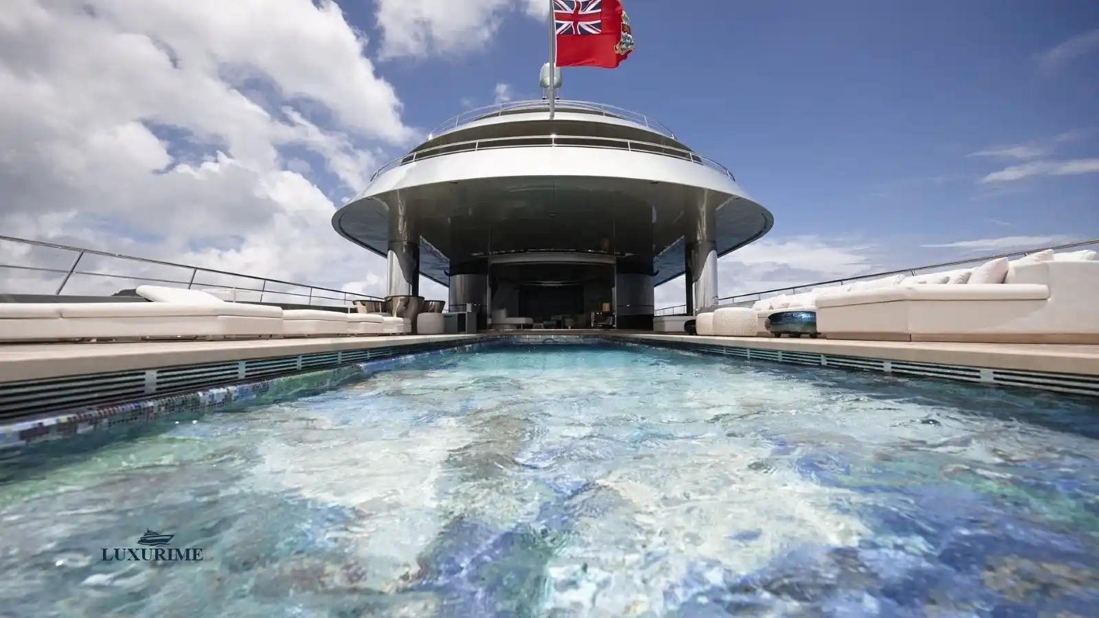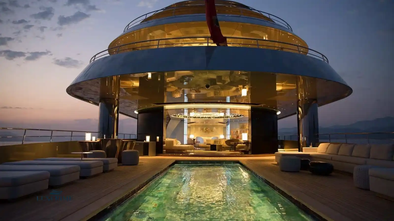 Stunning Pool Deck: A glass-bottomed swimming pool transforms into a dance floor with LED lighting.