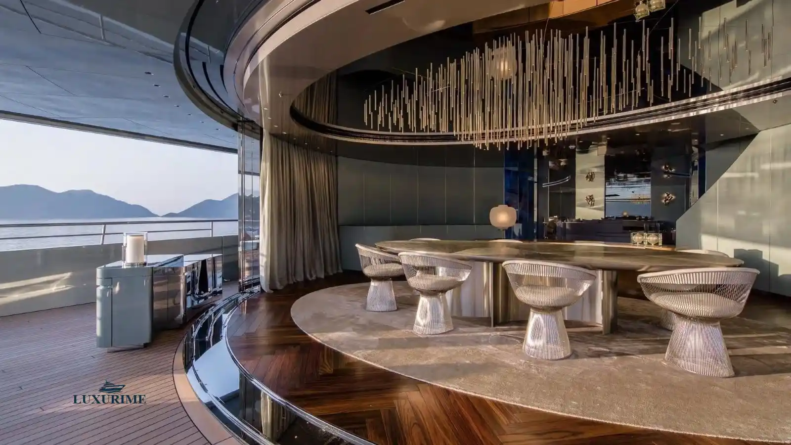 Elegant Main Salon: Featuring a grand piano, bespoke furnishings, and floor-to-ceiling windows for panoramic sea views.