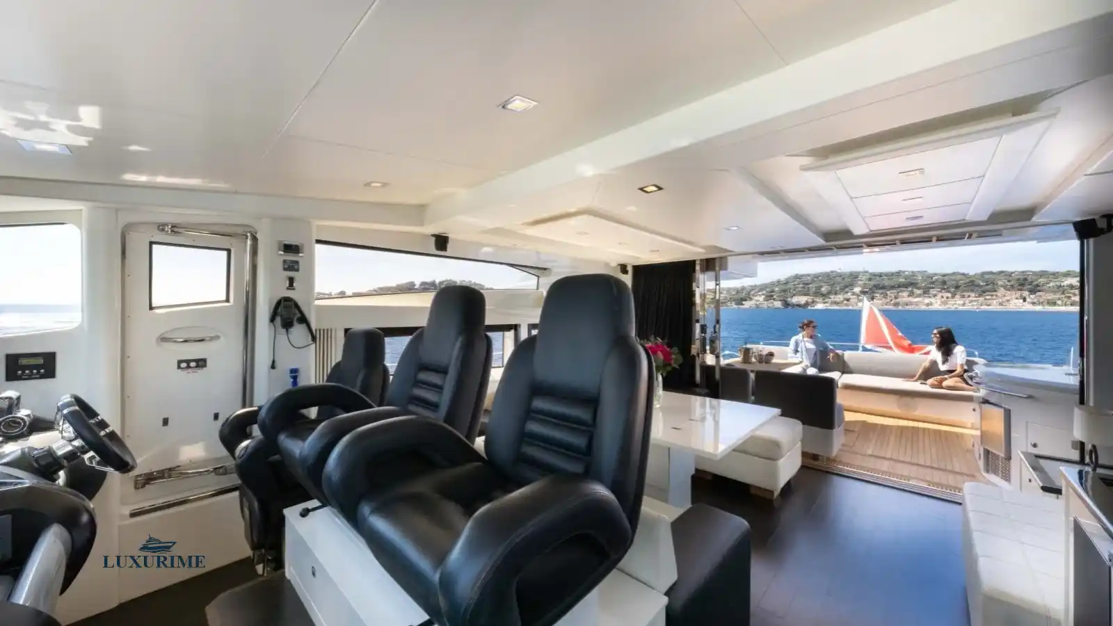 Fly Bridge – A stunning upper deck with sun loungers, seating, and panoramic views.