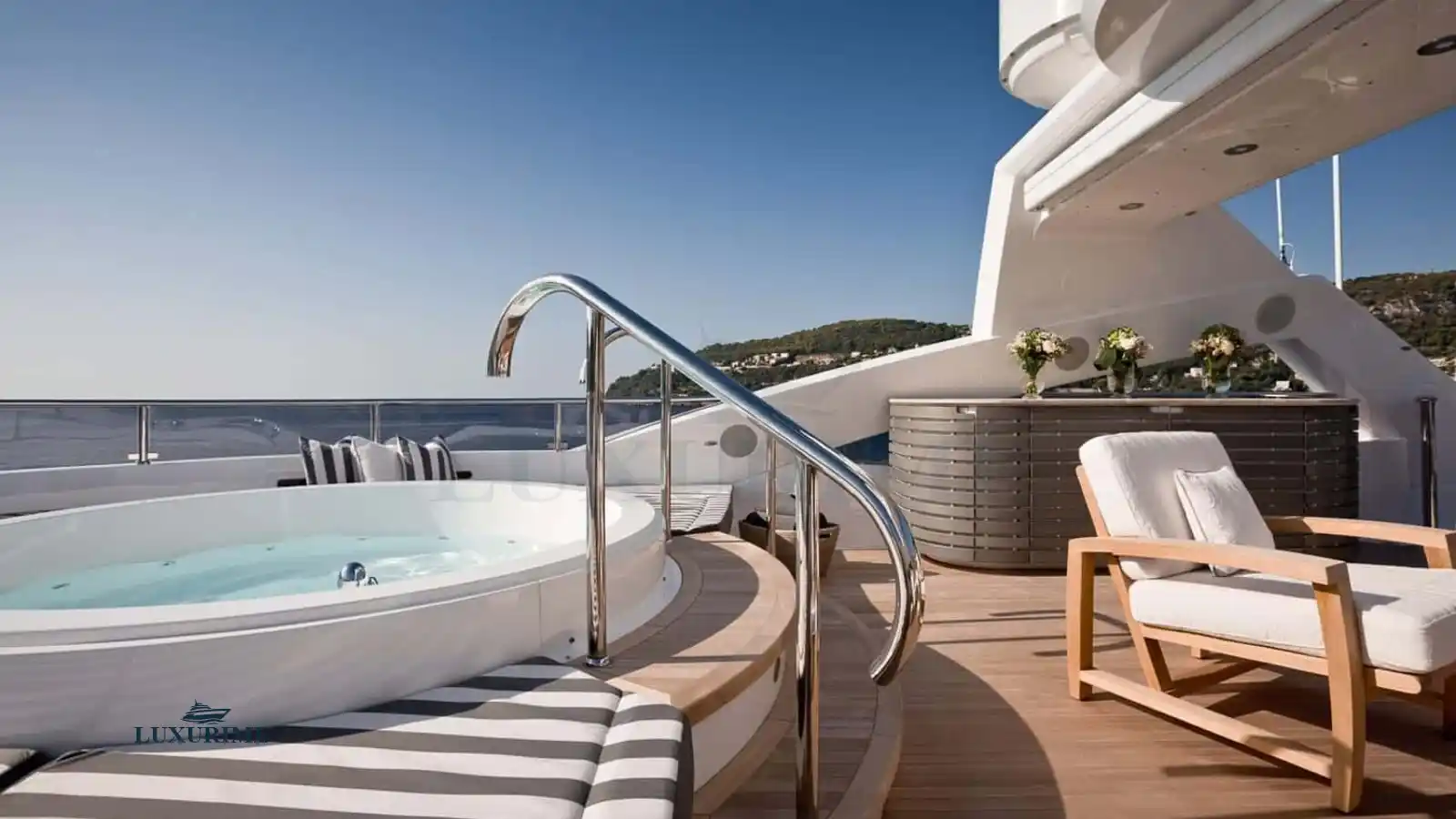• Expansive Sun Deck with a Jacuzzi, sunpads, and al fresco dining